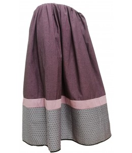 Falda de casera de color morado, con un pequeño bies en color rosa y la parte baja una franja de color gris con efecto relieve.