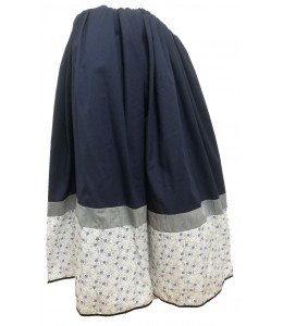 Falda de Casera de color azul marino, con franja de color gris claro y toda la zona de abajo con tejido de flores en blanco, azul y gris.