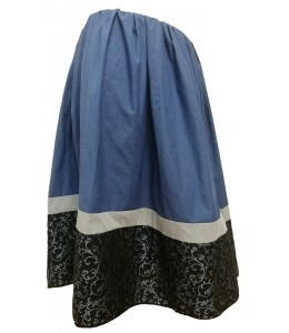Falda de casera de color granate o azul, con un pequeño bies en color gris y la parte baja una franja de color negro con detalles de flores en grises bordados a mano.